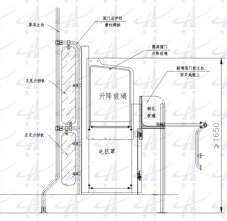 2、圍門前護欄采用整體式封擋,上部自動升降鋼化玻璃。